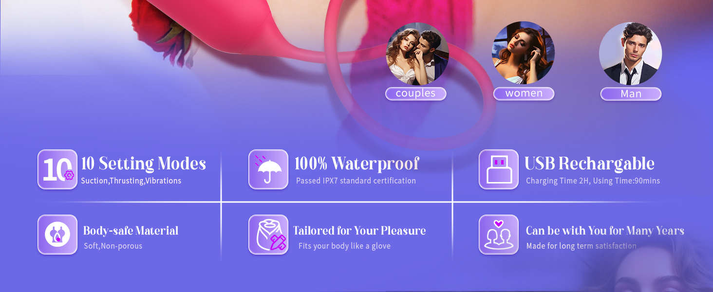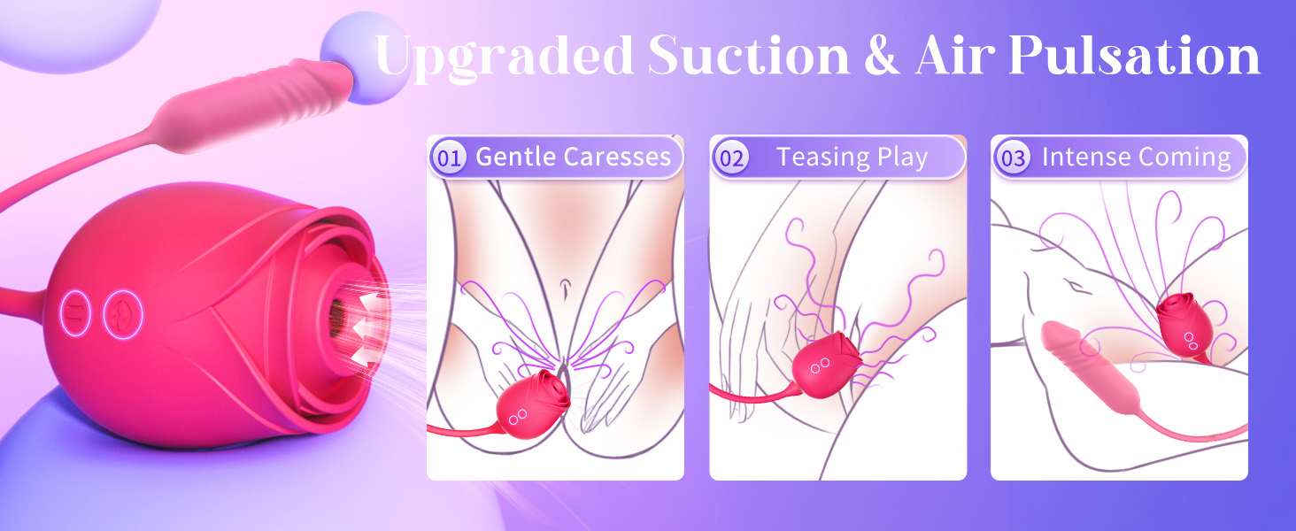 - 2024 Upgraded Rose Toy with sucking,thrusting &vibrating - Looking for something new, more interesting and more pleasure? Meet upgraded rose vibrator with sucking and thrusting vibrator. The suction vibrator stimulates your clitoral for external fun. Thrusting dildo works on your g spot with thrusting and vibrations for dual internal stimulation. This rose sex toy is for beginners and experts because the functions are controlled by different buttons, you can choose one function or both freely!